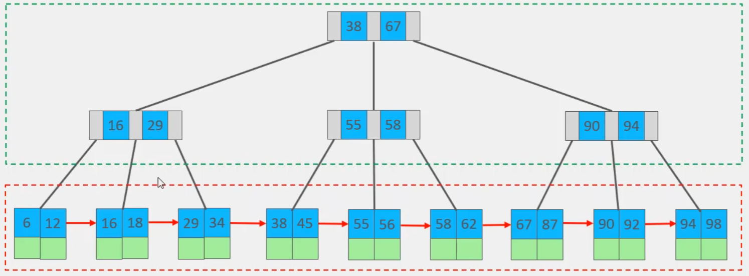 B+树:以4阶b+树为例,叶子节点中除了原来添加的数据(参考b树),还会储存非叶子节点中的所有数据,并且叶子节点形成了一个单向链表,非叶子节点虽然可能存一些数据,但只起到索引作用