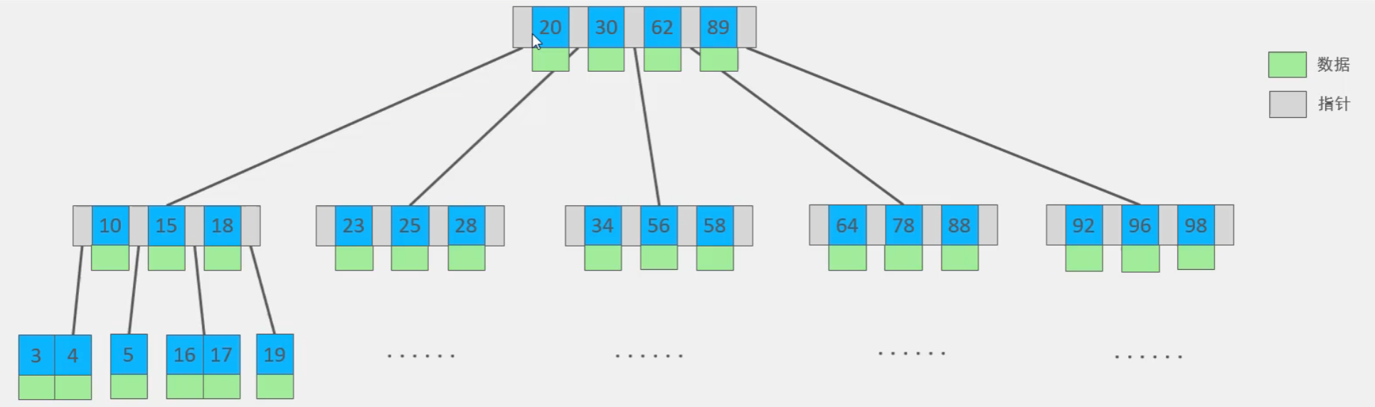 B树(也叫B-树)(多路平衡查找树):以最大度数为5的b-tree为例,每个节点最多存储4个key,5个指针,一旦某个节点的key到5个,就会分裂,中间的key成为分裂后两侧节点的父节点