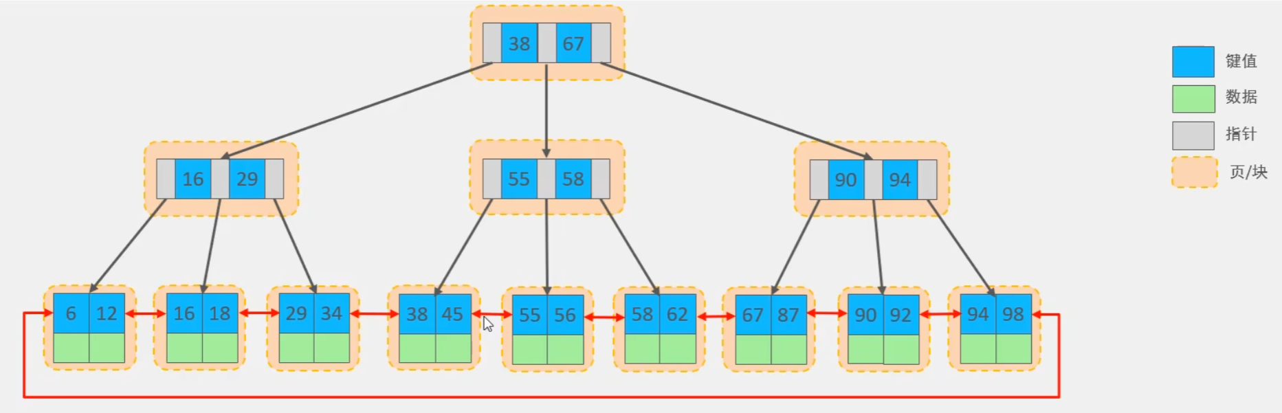 MySQL对B+树进行了优化:在b+树基础上,叶子结点增加指针指向相邻节点,形成双向循环链表